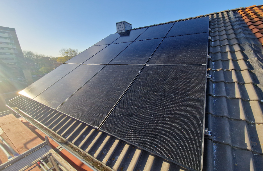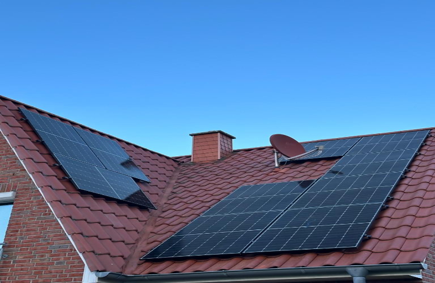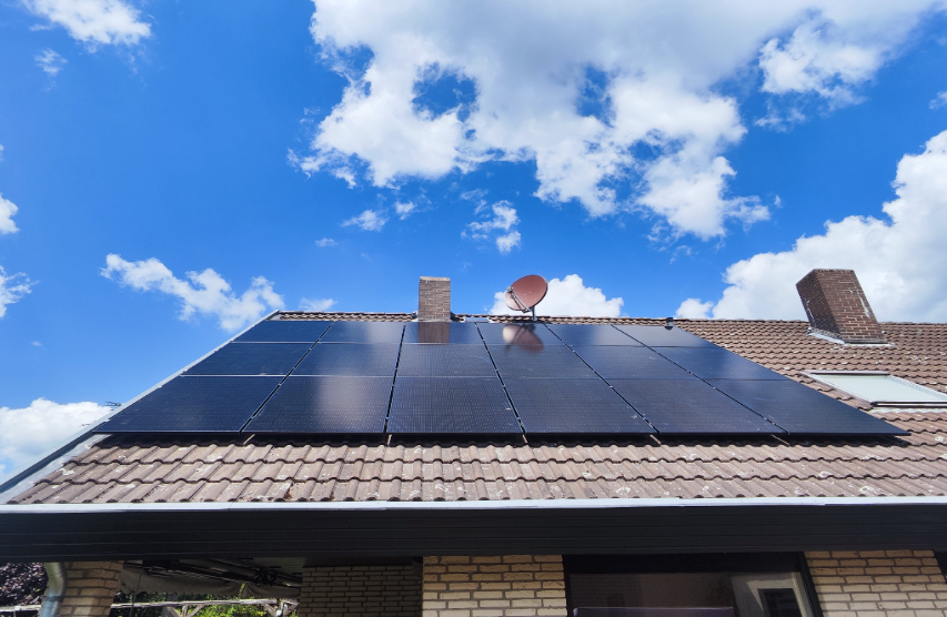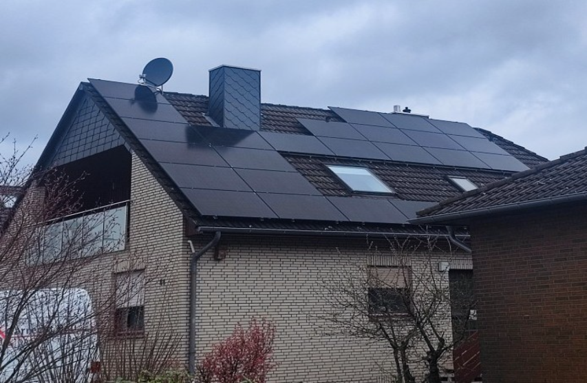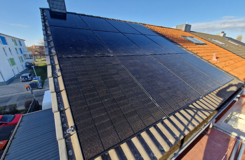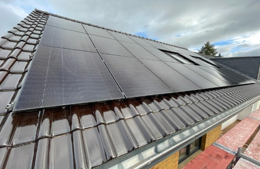 Dieses Wohnhausdach wurde mit einer 8,6 kWp starken Photovoltaikanlage ausgestattet. Die moderne Technik sorgt dafür, dass die Bewohner einen großen Teil ihres Strombedarfs direkt selbst erzeugen und nutzen können.